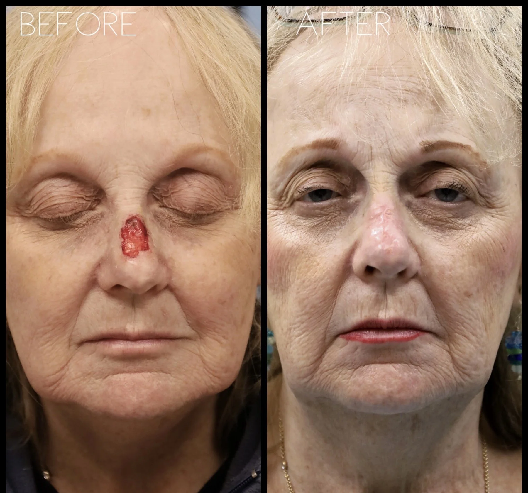 This patient had skin cancer on her forehead. She was worried about whether her eyebrows would remain symmetric and mobile after the removal and reconstruction process. This is her after the removal of her skin cancer and 3 months later, fully healed with her eyebrow symmetry and movement fully intact!